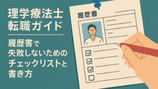 転職ノウハウ 理学療法士転職ガイド|履歴書で失敗しないためのチェックリストと書き方 理学療法士の転職で落とされない履歴書を書くための必須ポイントを解説。誤字脱字防止、資格欄の正しい書き方、職歴や志望動機の具体例など、失敗しないためのチェックリスト付きで詳しく紹介します。 2025.08.28 転職ノウハウ