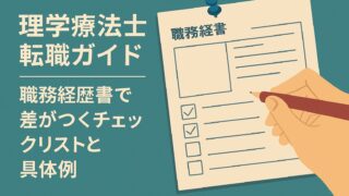 転職ノウハウ 理学療法士転職ガイド|職務経歴書で差がつくチェックリストと具体例 理学療法士の転職で差をつける職務経歴書の書き方を徹底解説。勤務先・担当領域の具体化、数字で示す経験、役割や成果のアピール方法までチェックリスト形式でわかりやすく紹介します。 2025.08.29 転職ノウハウ