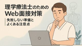 転職ノウハウ 理学療法士のためのWeb面接対策|失敗しない準備とよくある注意点 理学療法士がWeb面接で失敗しないための準備と注意点を解説。通信環境やカメラ映りの工夫、回答準備、当日のマナーまで実体験を交えて紹介します。オンライン面接で不安な方は必見です。 2025.09.28 転職ノウハウ