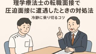 転職ノウハウ 理学療法士の転職面接で圧迫面接に遭遇したときの対処法|冷静に乗り切るコツ 理学療法士が転職面接で圧迫面接に遭遇したとき、どう冷静に対応すべきかを解説。具体的な受け答えの工夫や心構え、面接後の振り返りまで、落ち着いて乗り切るための5つのコツをまとめました。 2025.09.17 転職ノウハウ