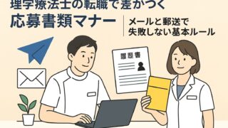 転職ノウハウ 理学療法士の転職で差がつく応募書類マナー|メールと郵送で失敗しない基本ルール 理学療法士の転職で意外と差がつくのが「応募書類の送り方」。メール・郵送それぞれの正しいマナーを解説します。件名の書き方や封筒の選び方など、基本ルールを押さえて印象アップを目指しましょう。 2025.10.10 転職ノウハウ