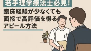 転職ノウハウ 若手理学療法士必見!臨床経験が少なくても面接で高評価を得るアピール方法 臨床経験が浅い若手理学療法士でも面接で高評価を得るためのアピール方法を解説。準備すべきポイントや評価されやすい視点を整理し、自信を持って面接に臨むためのヒントを紹介します。 2025.10.05 転職ノウハウ