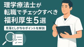 職場の選び方 理学療法士が転職でチェックすべき福利厚生5選|見落としがちなポイントを解説 理学療法士が転職先を選ぶときに見落としがちな福利厚生を解説。休暇制度、学会参加支援、子育て支援、住宅・通勤手当、健康サポートなど、長く働きやすい職場を見極める5つのポイントを紹介します。 2025.09.15 職場の選び方