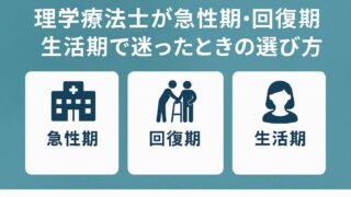 職場の選び方 理学療法士の働き方|急性期・回復期・生活期リハで迷ったときの選び方とポイント 理学療法士のキャリア選択に迷う方へ。急性期・回復期・生活期リハの特徴、メリット・デメリットを整理し、自分に合った働き方を見つけるための判断ポイントを解説します。 2025.09.11 職場の選び方