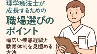 職場の選び方 理学療法士が成長するための職場選びのポイント|幅広い疾患経験と教育体制を見極める方法 理学療法士として成長できる職場の特徴とは?幅広い疾患経験を積む環境や教育体制の充実度を見極めることで、臨床力とキャリアの幅を広げることができます。転職や職場選びに迷う理学療法士必見のポイントを解説します。 2025.09.30 職場の選び方
