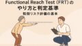 • 静的立位:両脚→閉脚→タンデム→片脚の順で難易度を上げて確認。重心の揺れや代償動作を観察。