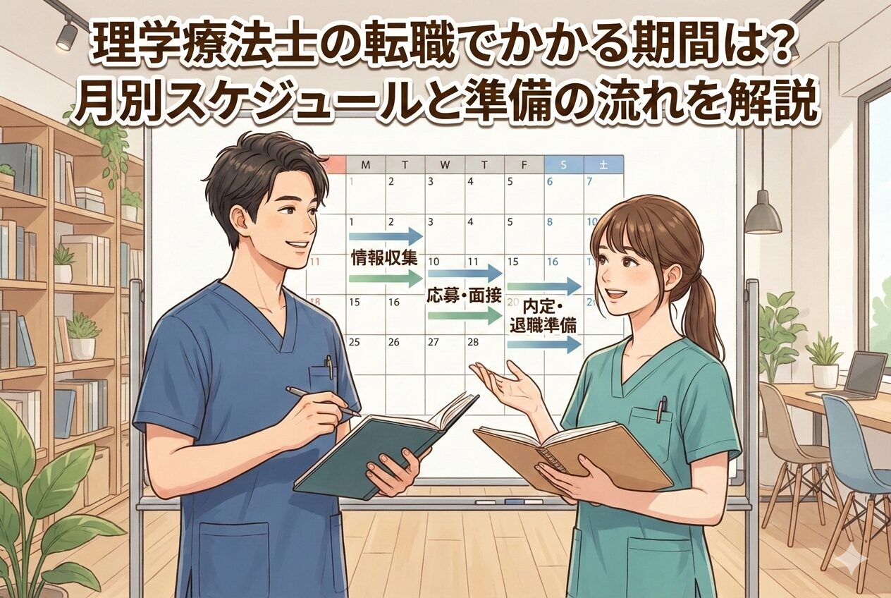 理学療法士の転職には、3〜6ヶ月かかるのが一般的です。情報収集から内定まで2〜3ヶ月、退職手続きに1〜2ヶ月、有給消化と入職準備に1ヶ月を見込んでおきましょう。