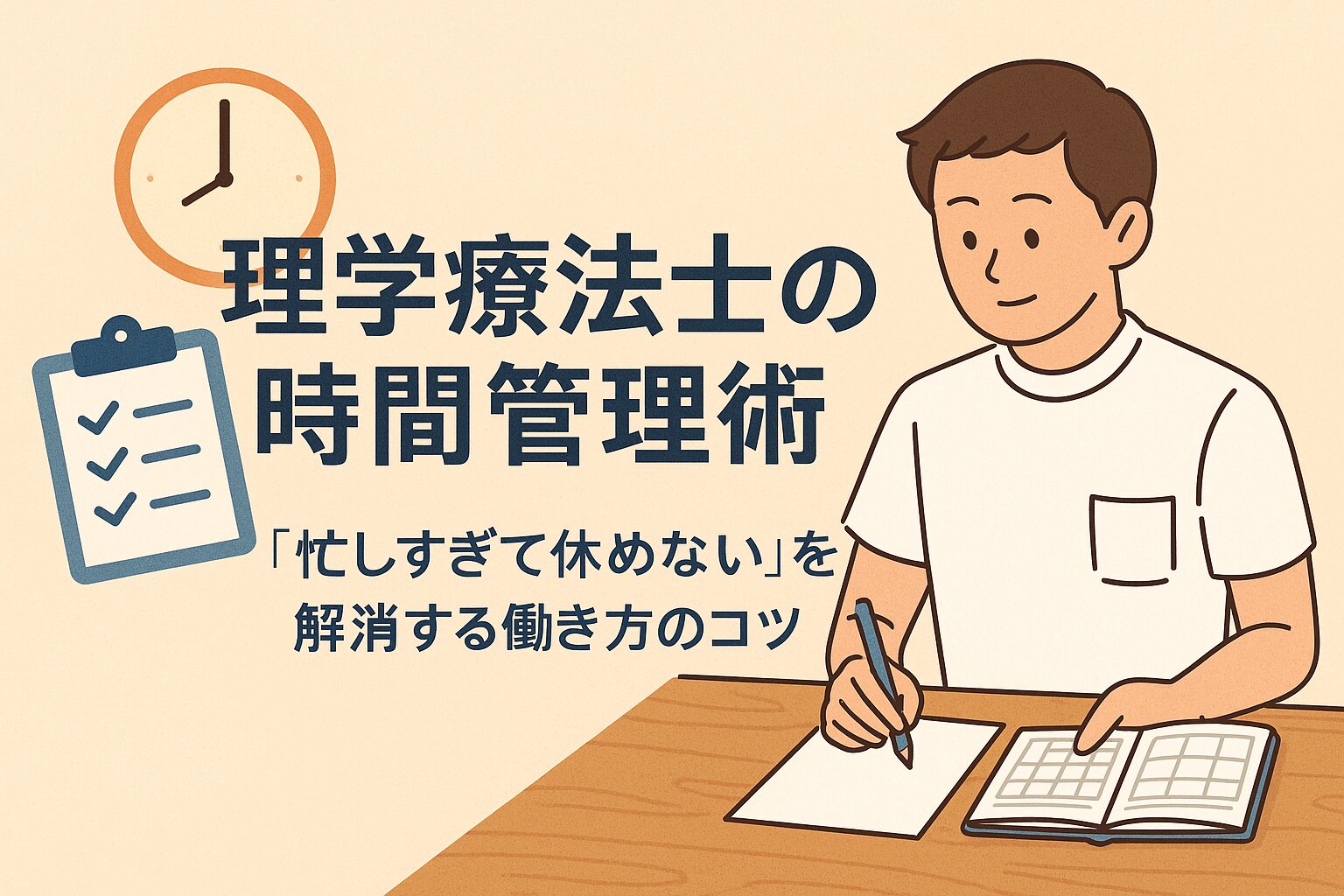 理学療法士として臨床に立つと、患者対応・記録・カンファレンス・後輩指導などで、毎日が「時間との戦い」になります。私自身も「休む暇がない」と感じた時期がありましたが、働き方を工夫することで少しずつ余裕を持てるようになりました。この記事では、理学療法士が「忙しすぎて休めない」と感じたときに取り入れたい時間管理のコツを紹介します。